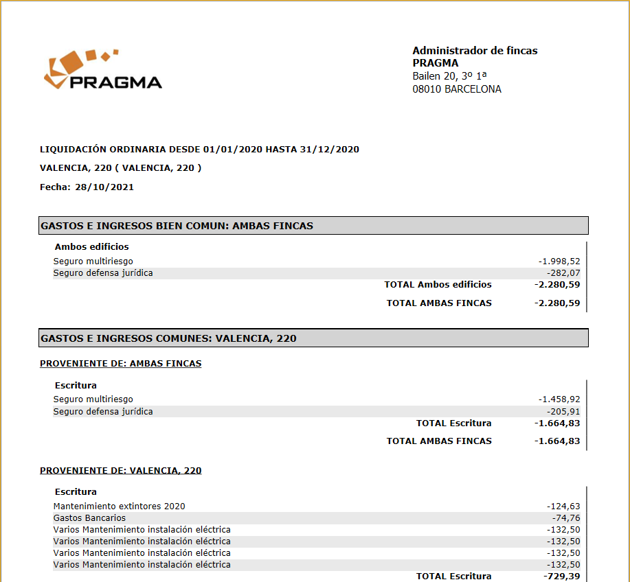 En la liquidación general se detallan los gastos e ingresos comunes de la comunidad, separándolos por grupos de liquidación. La mayor parte de las comunidades se componen de un único grupo de liquidación, pero puede darse el caso de que una comunidad se componga de dos o más escaleras, cada un con sus gastos propios y que además participen de gastos comunes, detallándolos en un bien común.