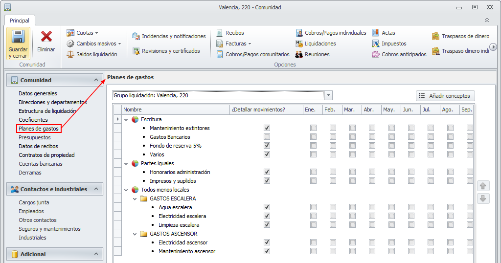 Los conceptos que no se encuentran en el plan de gastos, ya sea del bien común, grupo de liquidación o derrama, se muestran al principio, ordenados según el orden en que se encuentren en la tabla de conceptos de gastos comunitarios.