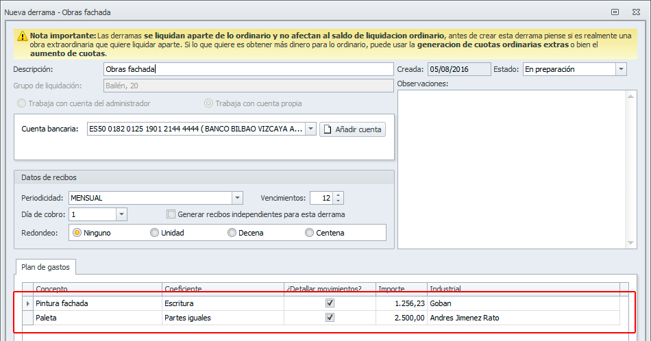 Los conceptos que no se encuentran en el plan de gastos o que sí se encuentran en él y cuya casilla Detallar movimientos está activada, se muestran detallados en la liquidación, ordenados por fecha de cobro ascendente.