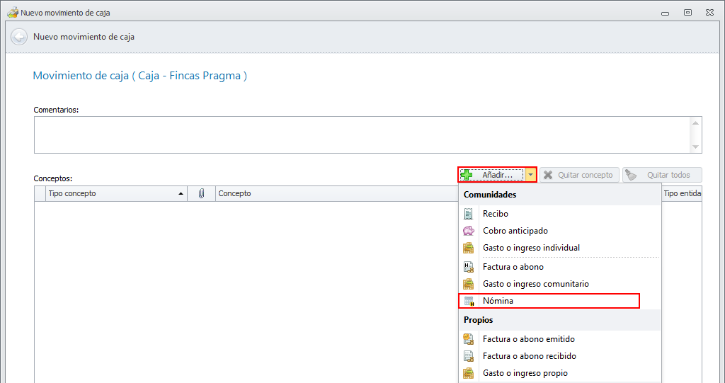 Al registrar un movimiento de caja, entre las opciones del apartado Comunidades se tiene disponible la opción Nómina.