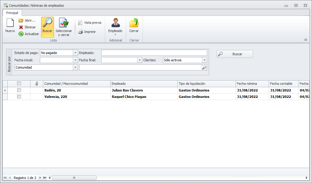 Al escoger esta opción, se muestran los registros de nóminas de empleados de comunidades pendientes de pagar para que el usuario escoja la que va a pagar.