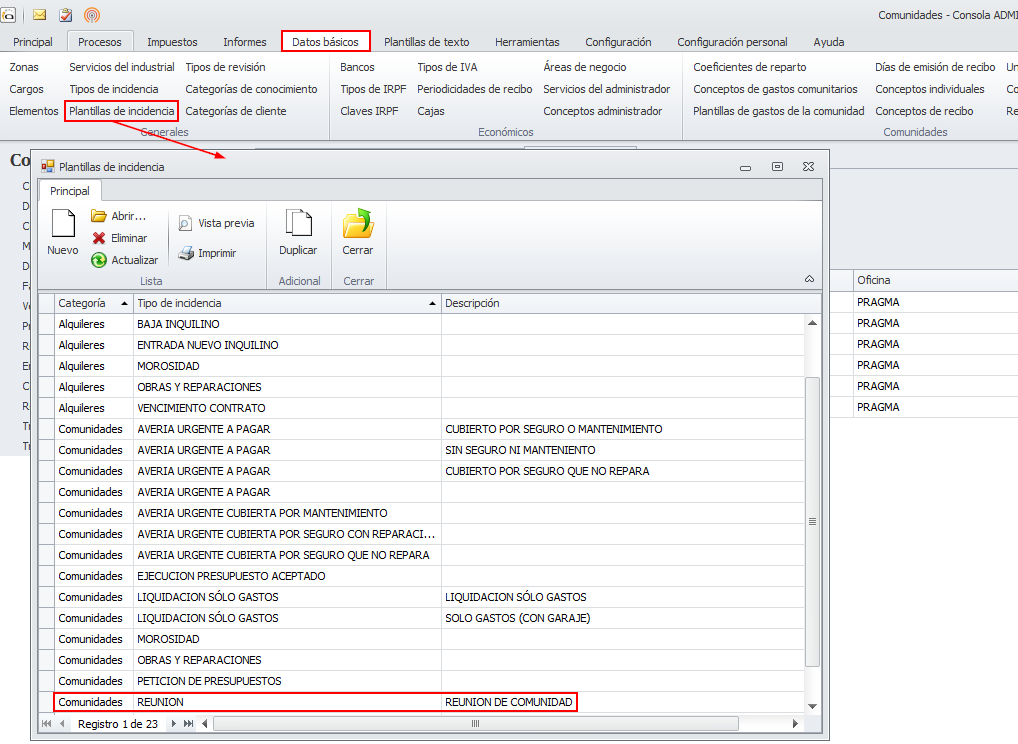 Las plantillas de incidencia para reuniones se encuentran junto con las demás plantillas de incidencias. Puede acceder a ellas desde el menú Datos básicos.