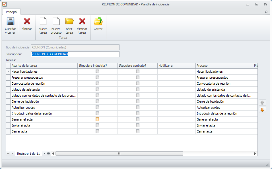 La plantilla de incidencia REUNIÓN instalada con Adminet tiene por defecto estas tareas.