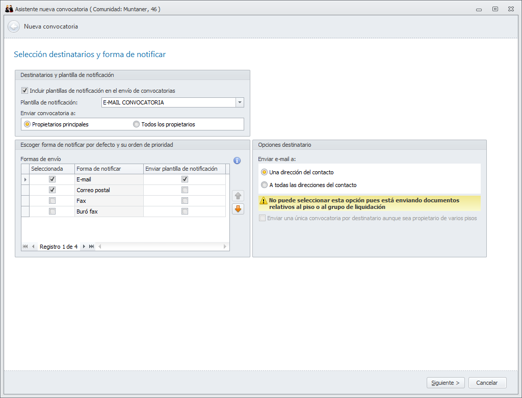 En la primera ventana, como en todos los asistentes de envío, se solicitan la forma de notificar, las opciones de selección de destinatarios y si desea incluir plantilla de notificación en el envío.