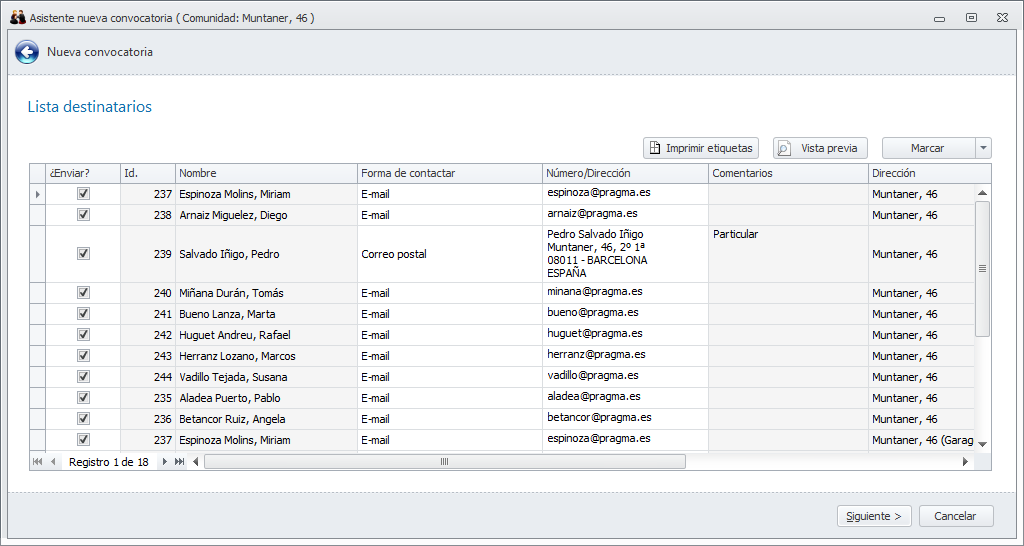 En la siguiente ventana, muestra los destinatarios y su forma de contactar. Puede excluir alguno si lo desea.