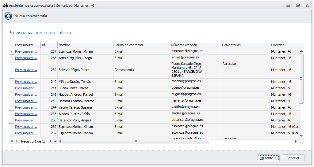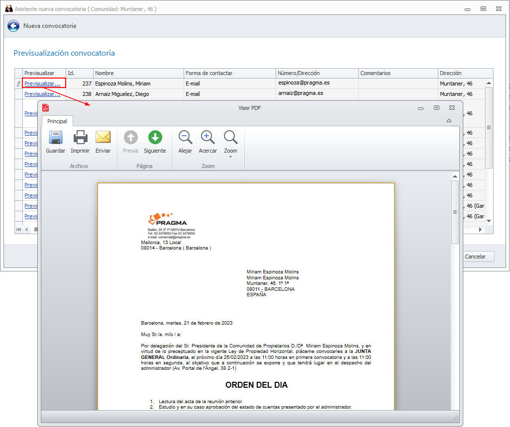 Haciendo clic en Previsualizar puede ver la convocatoria que se remitirá a un destinatario concreto.
