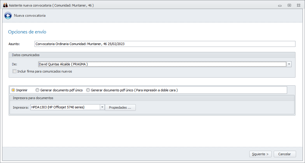 La ejecución del proceso Convocatoria de reunión, abre el asistente de envío de convocatoria.
