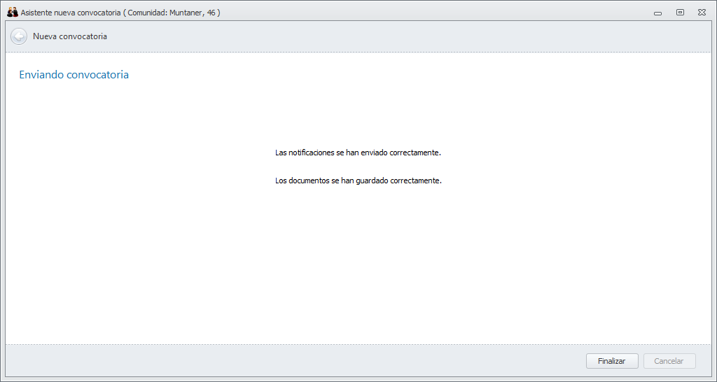 Preparar convocatoria. Consiste en un asistente que solicita al usuario los datos de la convocatoria y le permite guardarla sin necesidad de finalizar el proceso enviándola a los propietarios. Con posterioridad puede volverse a abrir y continuar con su cumplimentación. Haga clic aquí para más información sobre el proceso “Preparar convocatoria”.