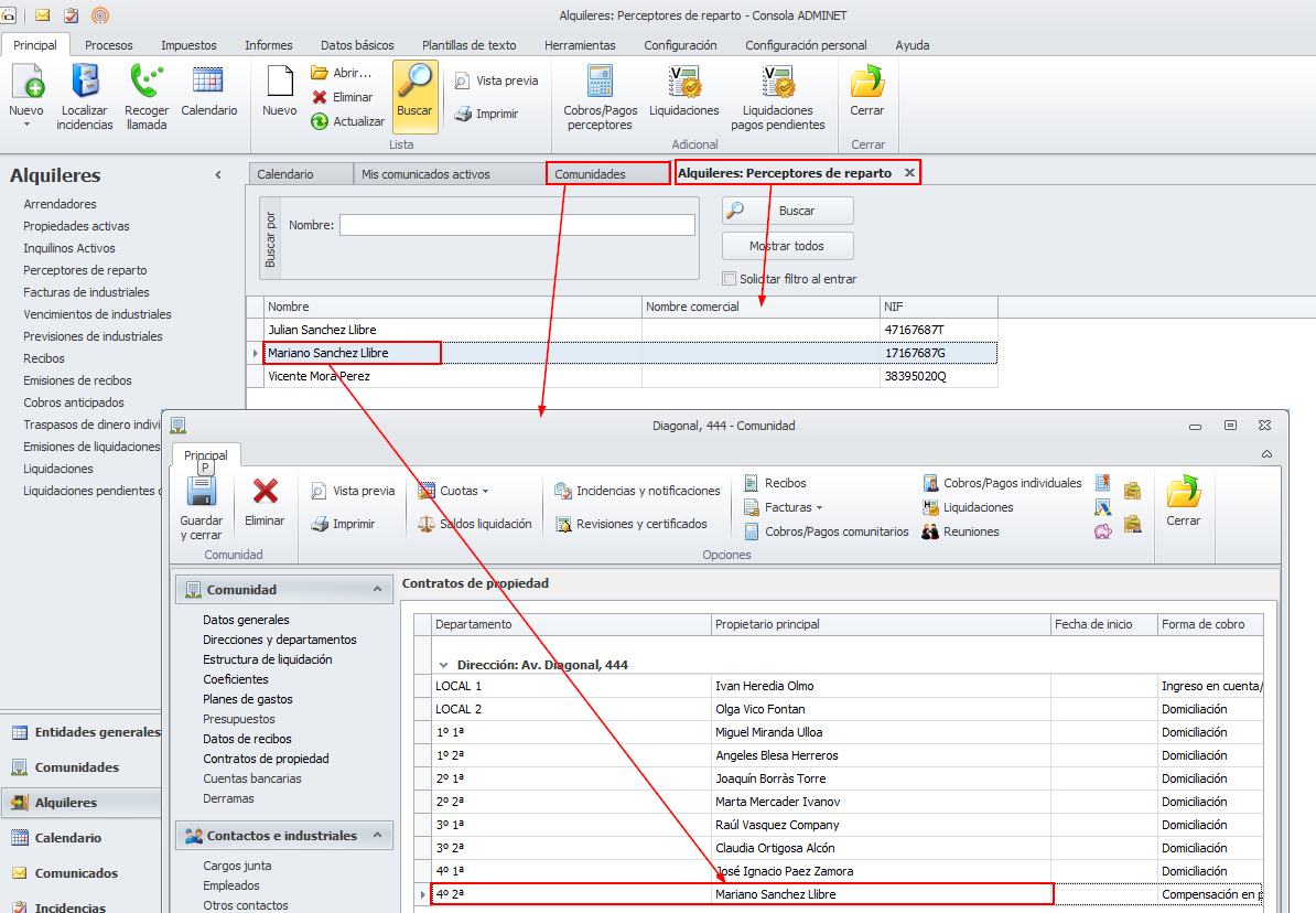 El ejemplo más claro es el de un arrendador cuya vivienda particular también es administrada por el administrador. Los recibos de cuotas y derramas de comunidad de su vivienda particular se le cargarán como gasto en la liquidación de reparto que le liquida el administrador.