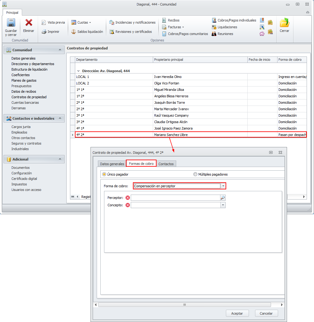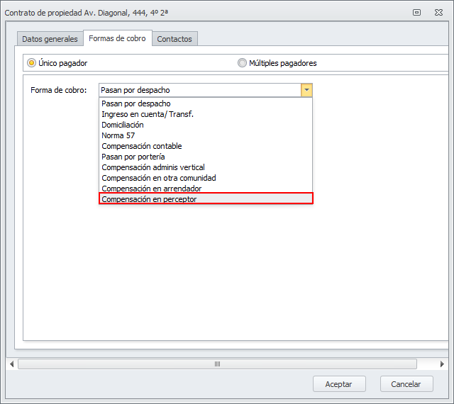 La forma de cobro Compensación en perceptor se puede escoger en la pestaña Formas de cobro de la ficha del contrato de propiedad.
