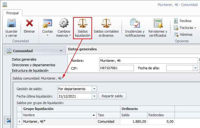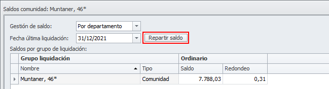 Sólo estará disponible si la comunidad todavía no ha emitido ninguna liquidación y en esa ventana está activada la opción Gestión saldo: Por departamento. En caso contrario no se mostrará.