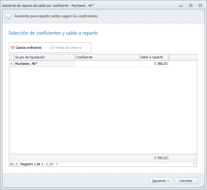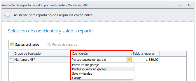 Gastos ordinarios / Fondo de reserva. Escoja la liquidación sobre la que introducirá los saldos indique el coeficiente por el que se repartirá y el saldo. En el siguiente ejemplo se repartirá un saldo de 1880€ a partes iguales entre las viviendas (sin el garaje).