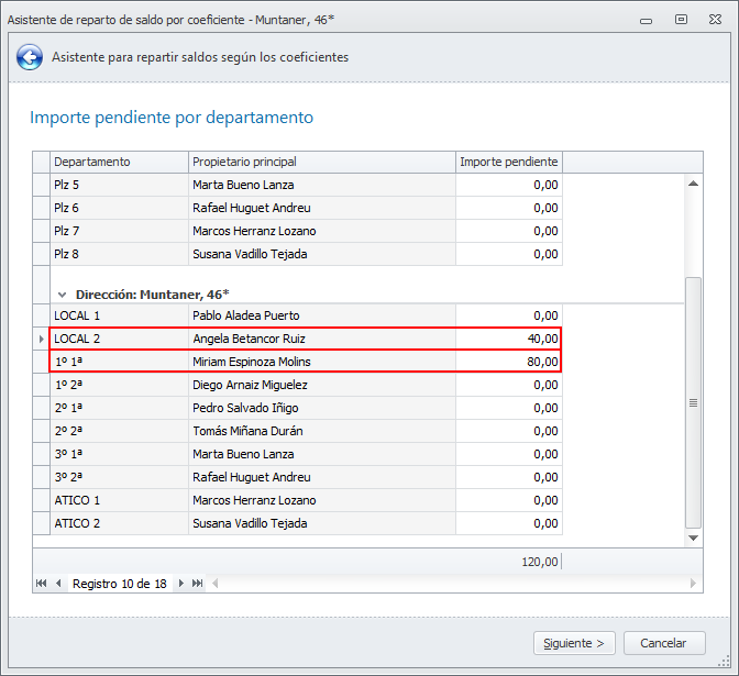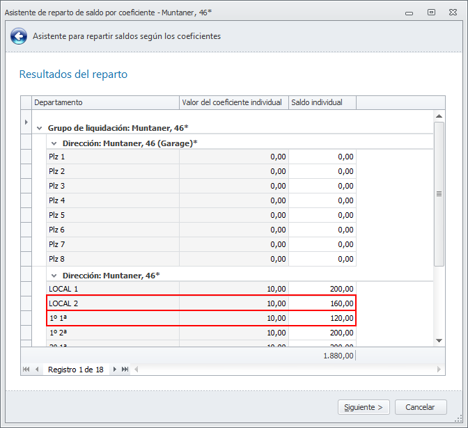Repartir saldo está pensado para cuando no dispone de los saldos individuales y desea repartir el saldo global entre los departamentos. Lo más frecuente en estos casos es repartir el saldo por coeficiente general, descontando los recibos pendientes de cobro que tenga cada departamento.