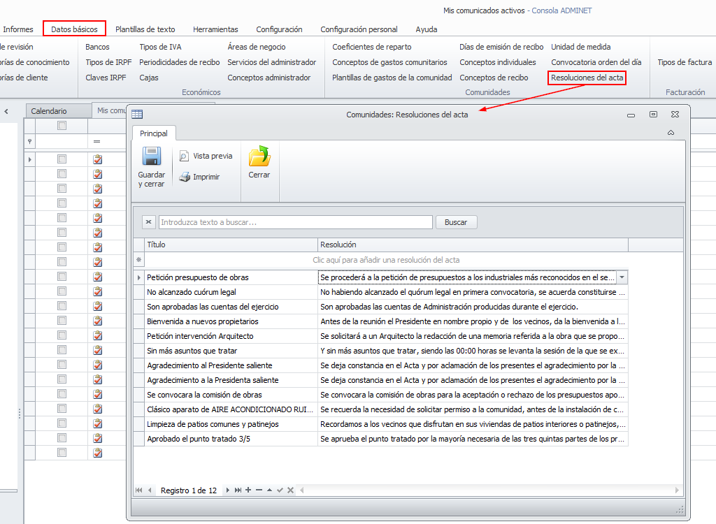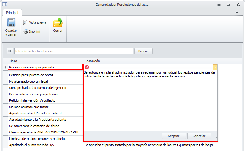 Las resoluciones del acta son un conjunto de textos que se usan con frecuencia al informar los acuerdos de las reuniones de comunidad. El administrador puede introducir tantas resoluciones como desee, asignándole un texto identificativo y el contenido del párrafo que se incluirá en el acta.
