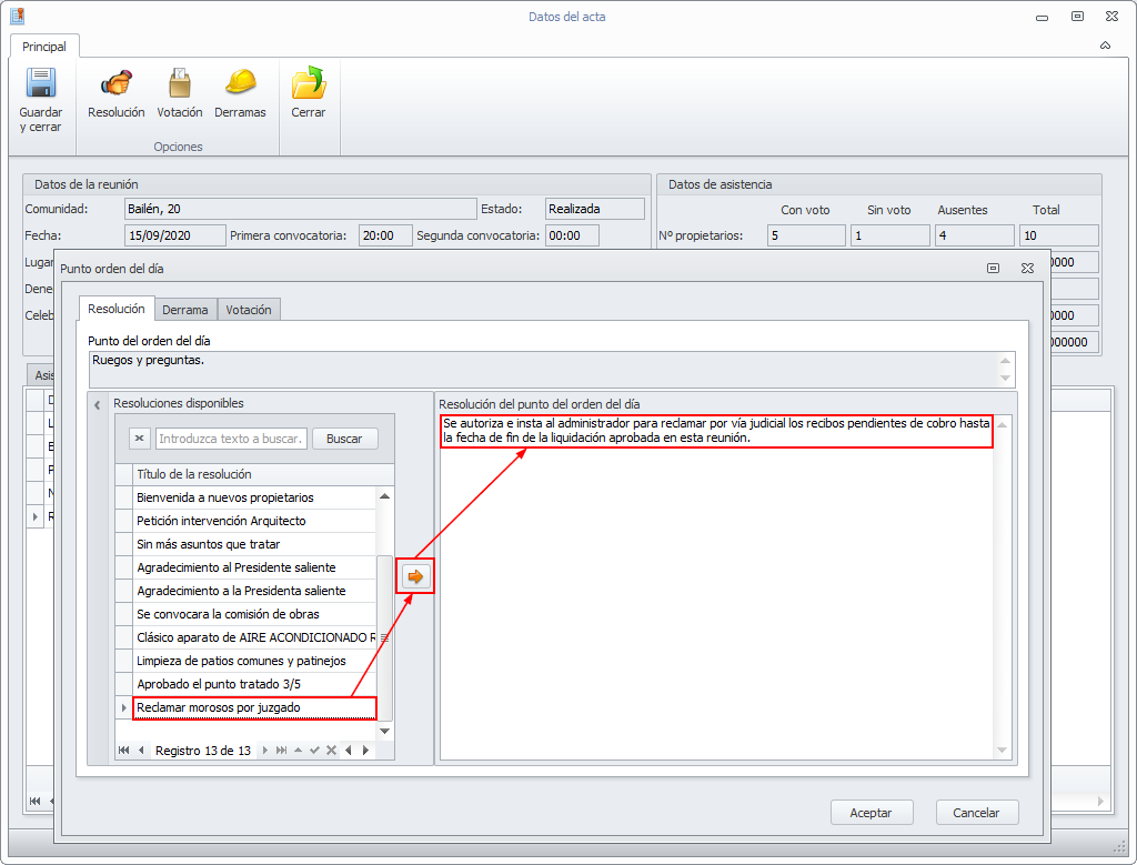 Al introducir los datos de la reunión, en los puntos del orden del día se puede añadir una resolución, escogiendo el título y haciendo clic en la flecha de la parte central de la ventana.