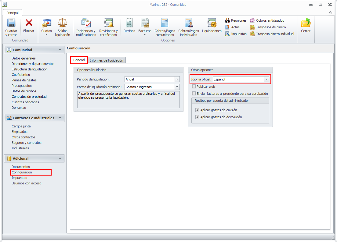 La liquidación general, la liquidación resumen, el presupuesto general y el resumen de cuotas se generarán en el idioma que se determine en la ficha de la comunidad.
