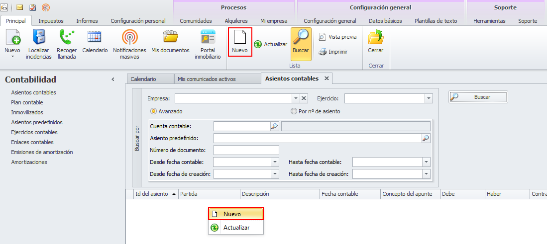 Para añadir un nuevo asiento, haga clic en Nuevo.