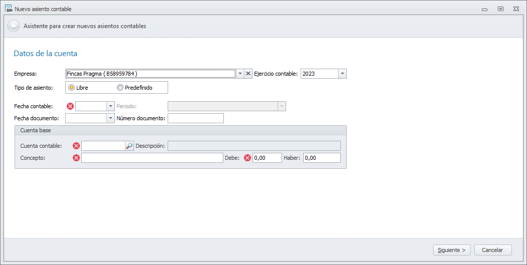 Se abrirá el asistente de creación de nuevo asiento contable. Esta es la primera ventana.