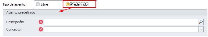 Tipo de asiento. Debe indicar si partirá de un asiento predefinido o si prefiere registrar un asiento indicando una a una todas sus cuentas. Haga clic aquí para más información sobre qué es un asiento predefinido. En caso de escoger Predefinido, deberá escoger el predefinido y el concepto para el asiento.