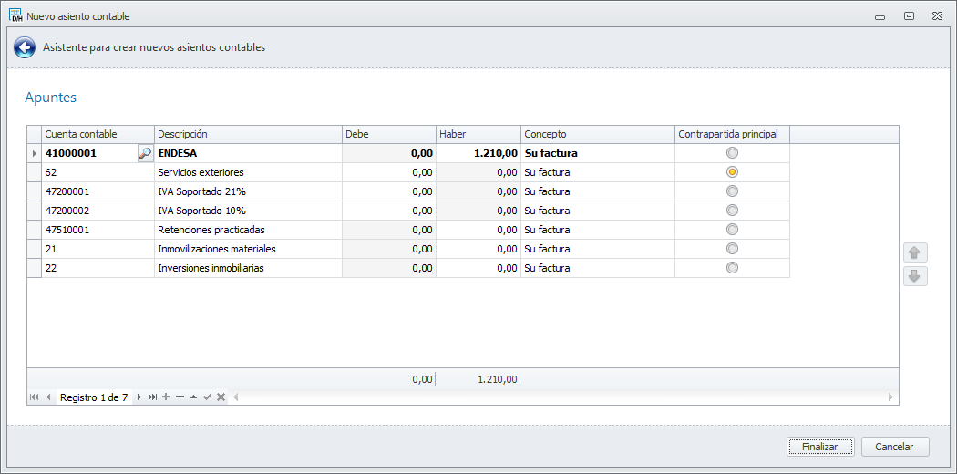 La segunda ventana del asistente, sirve para indicar las demás cuentas e importes que componen el asiento. La primera línea (que se muestra en negrita) corresponde a la cuenta base para facilitar una visión completa del asiento.