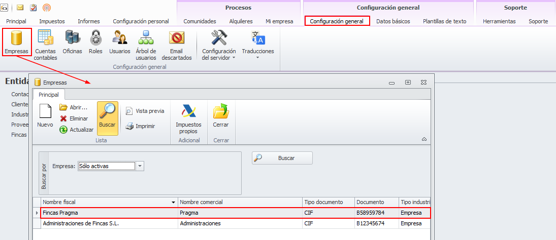 Para cambiar la configuración del enlace contable, vaya a la opción de menú Configuración y haga clic en el botón Empresas. Escoja la empresa cuya configuración desea cambiar.