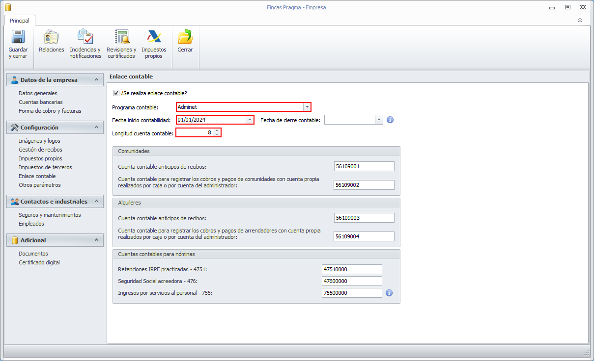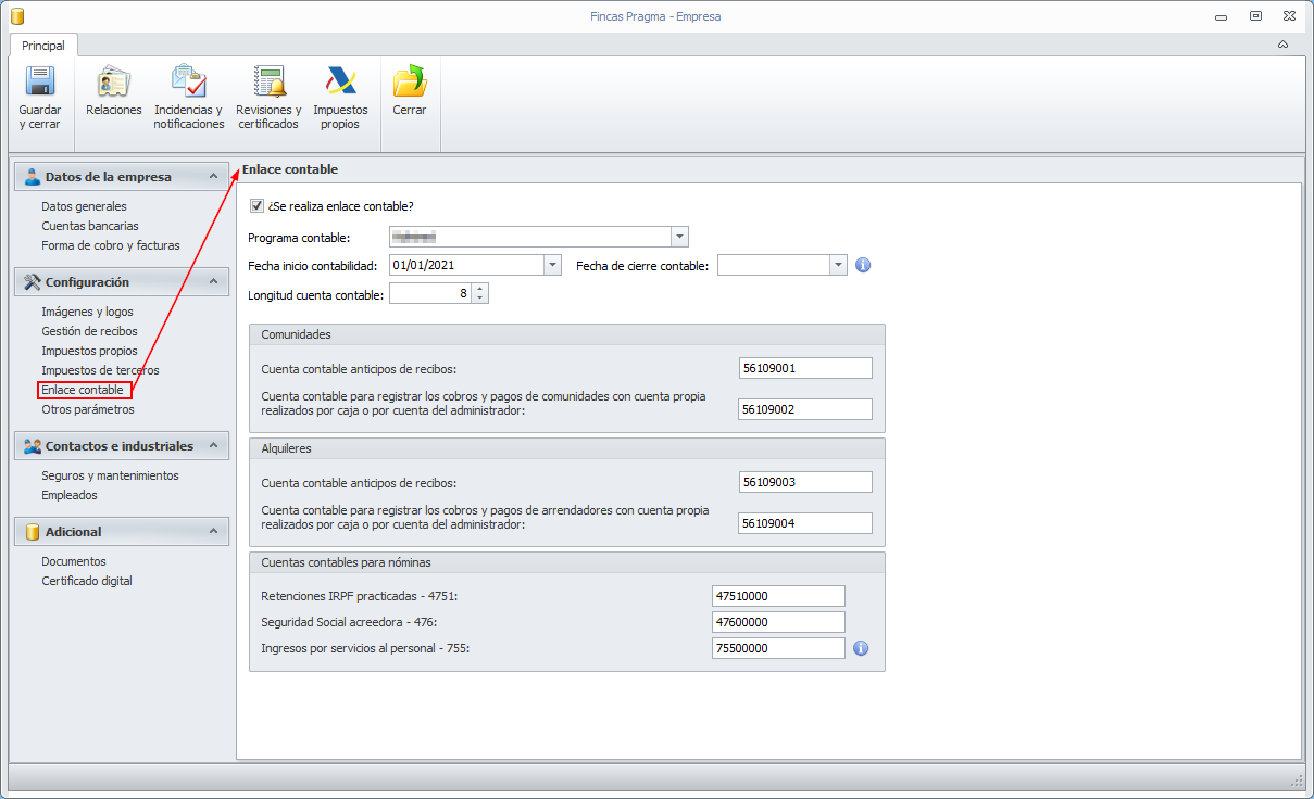 En la ventana que se abre, vaya a la sección Enlace contable. Verá que el valor de la casilla Programa contable es distinto de Adminet.