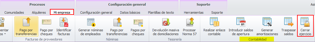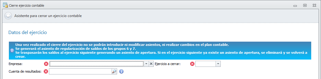 Para poder ejecutar el cierre de un ejercicio contable, debe estar abierto el ejercicio siguiente. Haga clic aquí para ver cómo abrirlo.