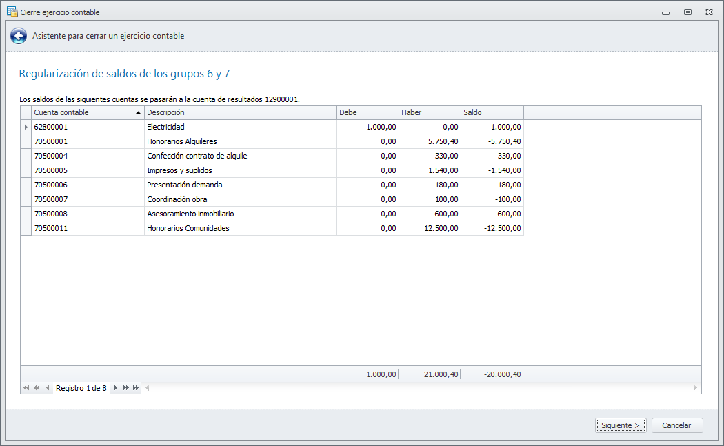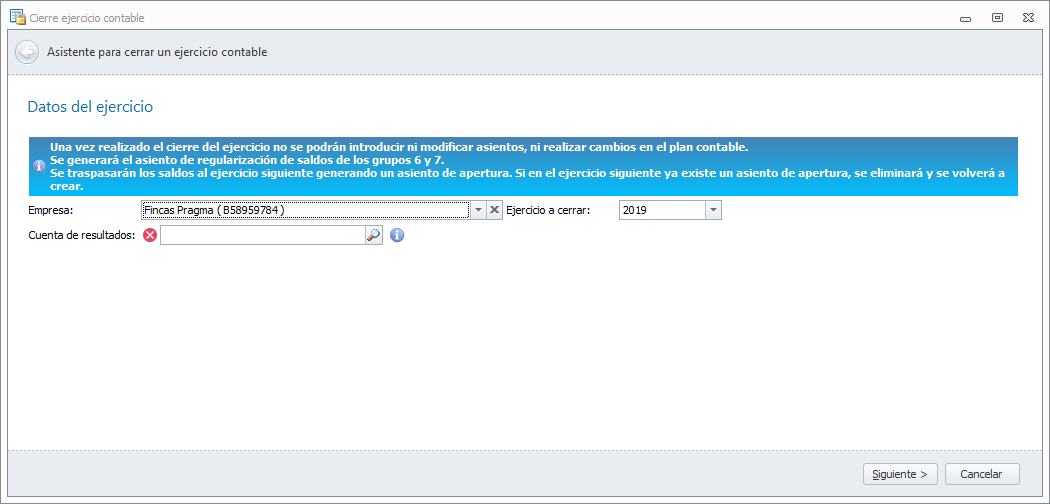 Una vez seleccionada la empresa y ejercicio a cerrar, se debe escoger la cuenta de resultados destinataria de los saldos de las cuentas de los grupos 6 y 7.