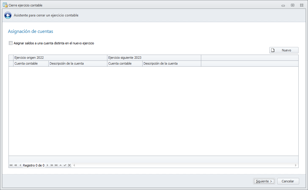 La siguiente ventana, permite especificar nuevas cuentas de destino en el ejercicio siguiente para los saldos de las cuentas del ejercicio que se cierra.