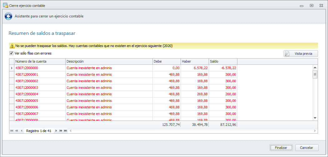 La siguiente ventana muestra las cuentas del ejercicio que se cierra que no se encuentran abiertas en el nuevo ejercicio. Si se da este caso, debe abrir estas cuentas en el nuevo ejercicio antes de realizar el traspaso.