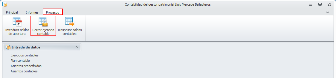 Para cerrar un ejercicio contable, vaya a la ventana Contabilidad del gestor patrimonial y, desde el menú Procesos, acceda a la opción Cerrar ejercicio contable.