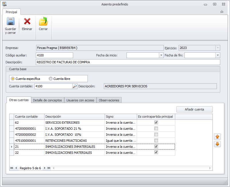 Para determinar la contrapartida de la cuenta base se localizan, en el predefinido con el que se origina, las cuentas marcadas como Es contrapartida principal. La primera de ellas que contenga importe en el asiento que se esté creando será la contrapartida para el apunte de la cuenta base.