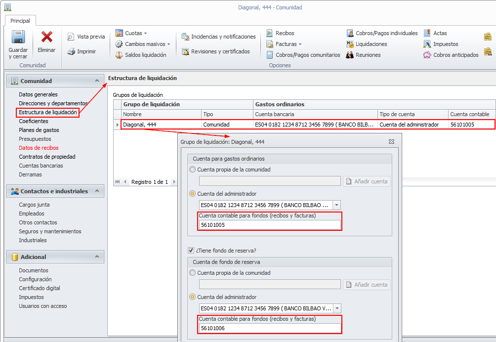 En cada grupo de liquidación se indica si se administra con cuenta bancaria del administrador o con cuenta propia de la comunidad.