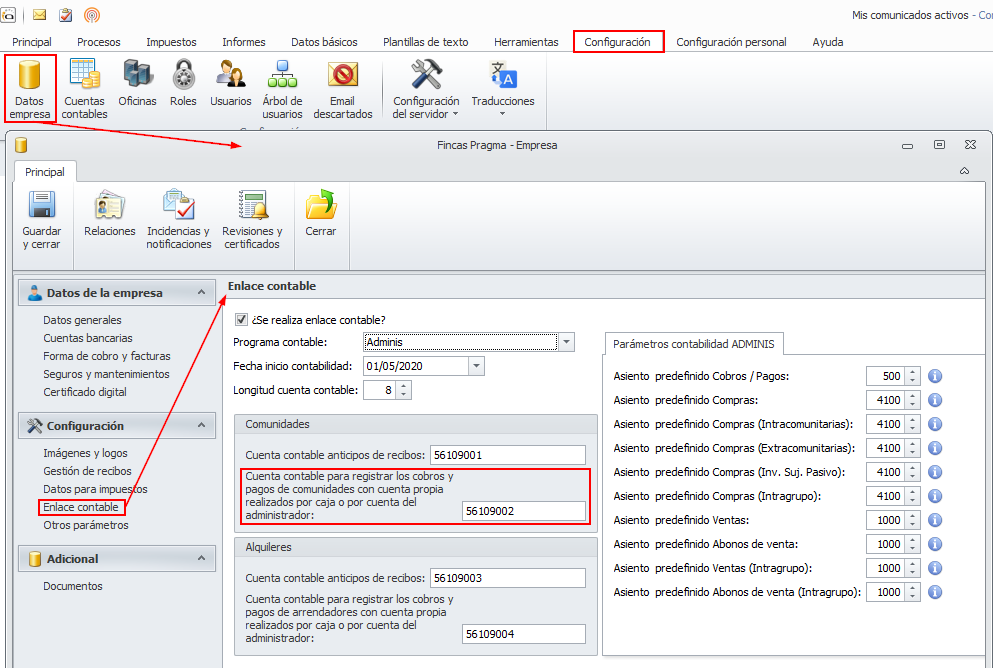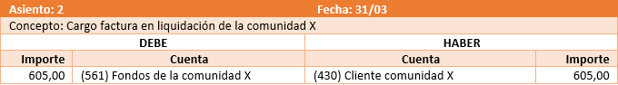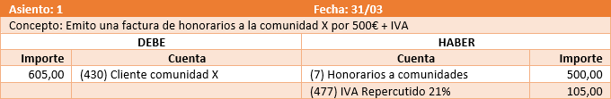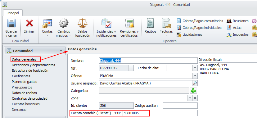 En la sección de datos generales de la ficha de la comunidad se debe indicar la cuenta de cliente para las facturas que les emita el administrador, incluyendo los honorarios de administración. Normalmente debe ser una cuenta del grupo 430. Se registra en el debe el devengo de la factura y en el haber el cobro o cargo en liquidación.
