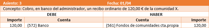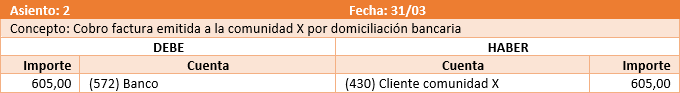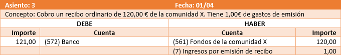 Para cobrar de la comunidad los gastos pagados y los recibos devueltos, el asiento es el siguiente.