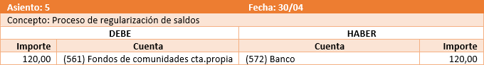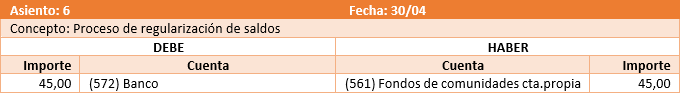 Éste proceso genera un asiento por cada cobro o pago que se regulariza con la comunidad.