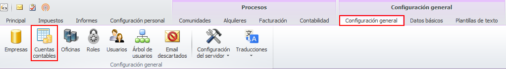 La definición de las cuentas contables en Adminet se realiza mediante el botón Cuentas contables del menú Configuración general.