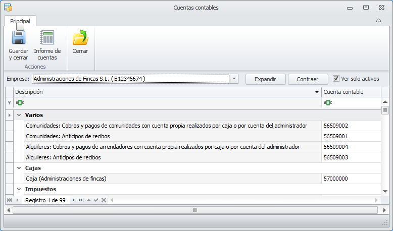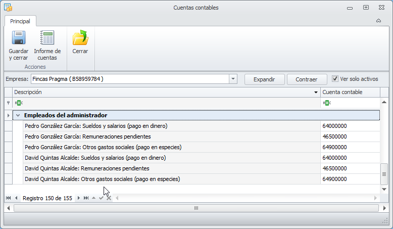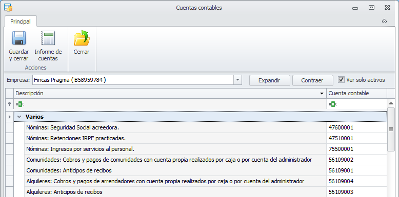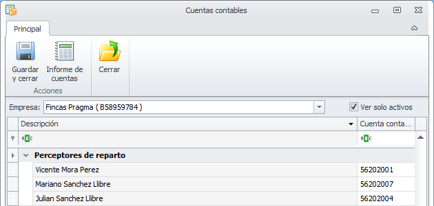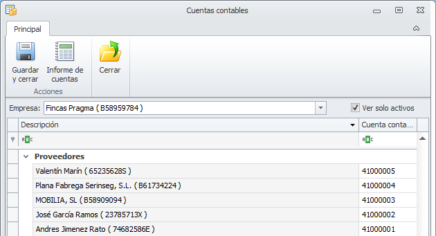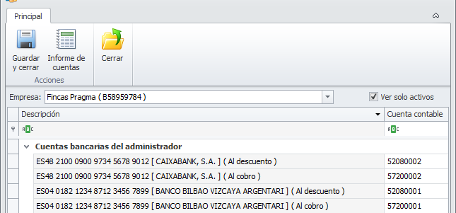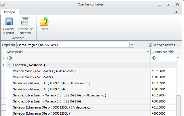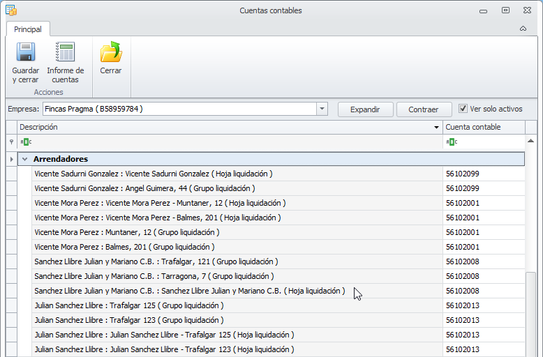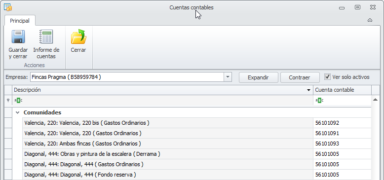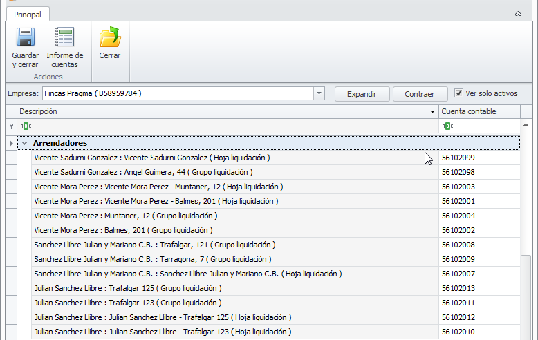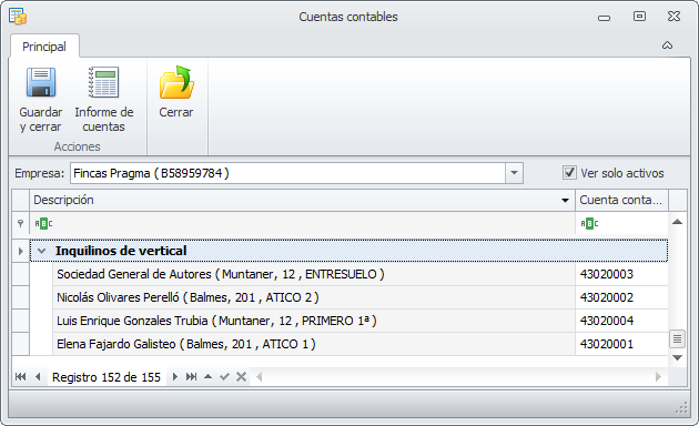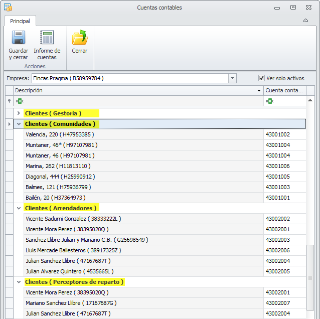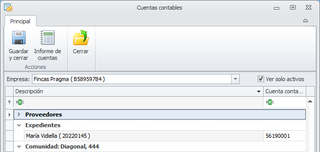 Ver sólo activos. Si activa esta casilla, para comunidades, macrocomunidades, arrendadores, perceptores, clientes, proveedores y empleados ocultará las líneas las entidades dadas de baja . Si la desactiva, se muestran también las cuentas de las entidades dadas de baja.