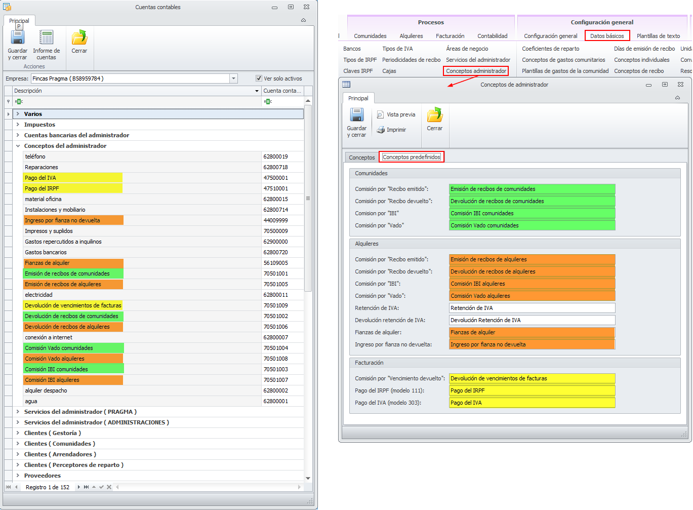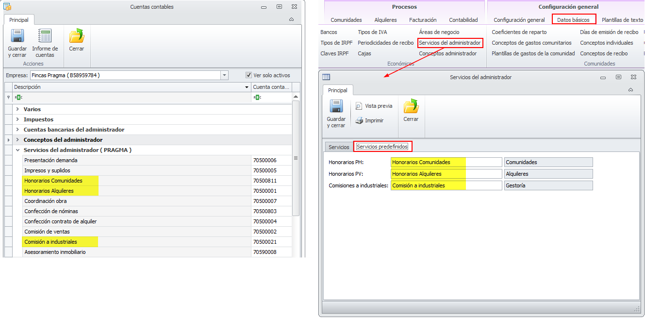 Se indican los textos de los servicios predefinidos por el programa y las cuentas contables donde registrar sus movimientos. En la siguiente imagen puede ver en la parte derecha los servicios predefinidos del administrador y en la parte izquierda la vista de cuentas contables en la que se destacan esos conceptos, que aparecen con el nombre que usted le haya personalizado en la tabla de servicios del administrador.