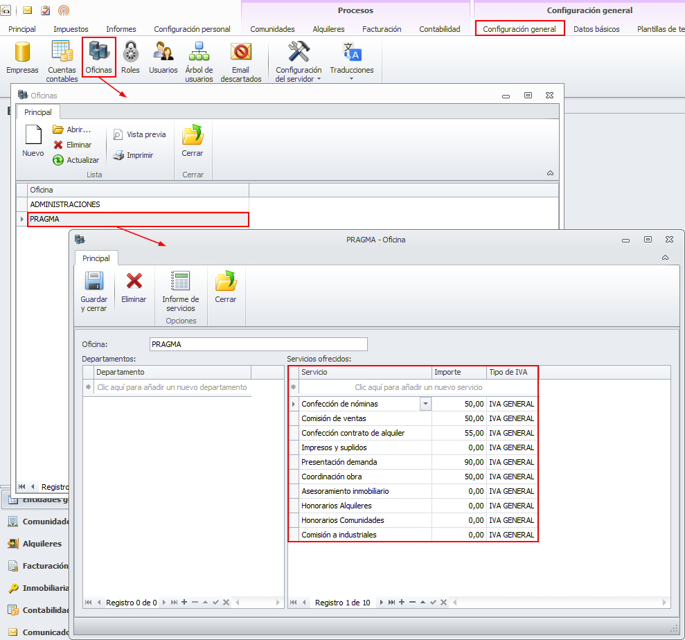 En la ficha de oficina (menú Configuración General, botón Oficinas) debe accederse a la oficina u oficinas disponibles e indicar qué servicios se prestan en dicha oficina.