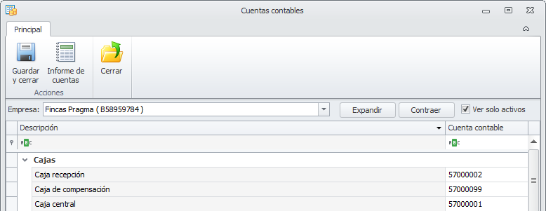Las cuentas de caja es donde se contabilizarán los movimientos de cobro y pago en efectivo, así como los cobros en cheque, antes de ser ingresados en la entidad bancaria. Normalmente se usará una cuenta del grupo 570 (Caja), aunque puede asignarle el código que desee.