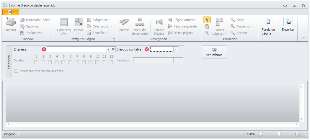 Para obtener el diario contable resumido, vaya a la ventana Contabilidad del gestor patrimonial y, desde el menú Informes, acceda a la opción Diario contable resumido.