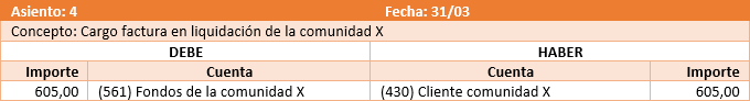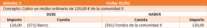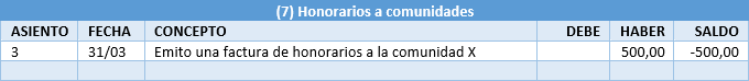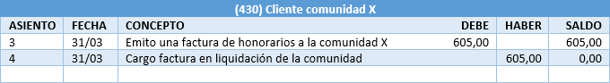 Entra una deuda de un cliente (la comunidad) con el administrador. Salen honorarios (un trabajo realizado por la empresa) y una deuda de la empresa con Hacienda por el importe del IVA.