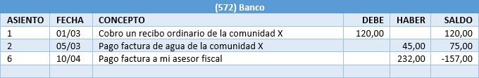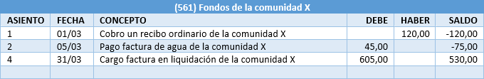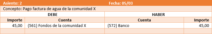 Sale dinero en el banco. Entra deuda de la comunidad, es decir, disminuyen sus fondos depositados.