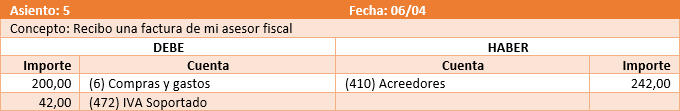 En la cuenta de IVA Soportado, se registra en el debe el IVA de las facturas recibidas. En el haber se compensará cuando se realice el pago trimestral.