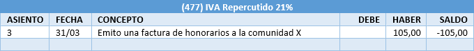 En la cuenta de IVA Repercutido, se registra en el haber el IVA de las facturas emitidas. En el debe se compensará cuando se realice el pago trimestral.