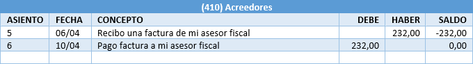 En las cuentas de proveedores y acreedores se registran en el haber las facturas recibidas y en el debe los pagos de las mismas. En caso de recibirse un abono, se registra en el debe su recepción y en el haber su compensación.