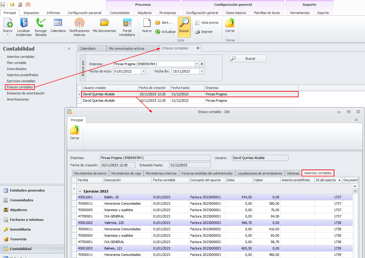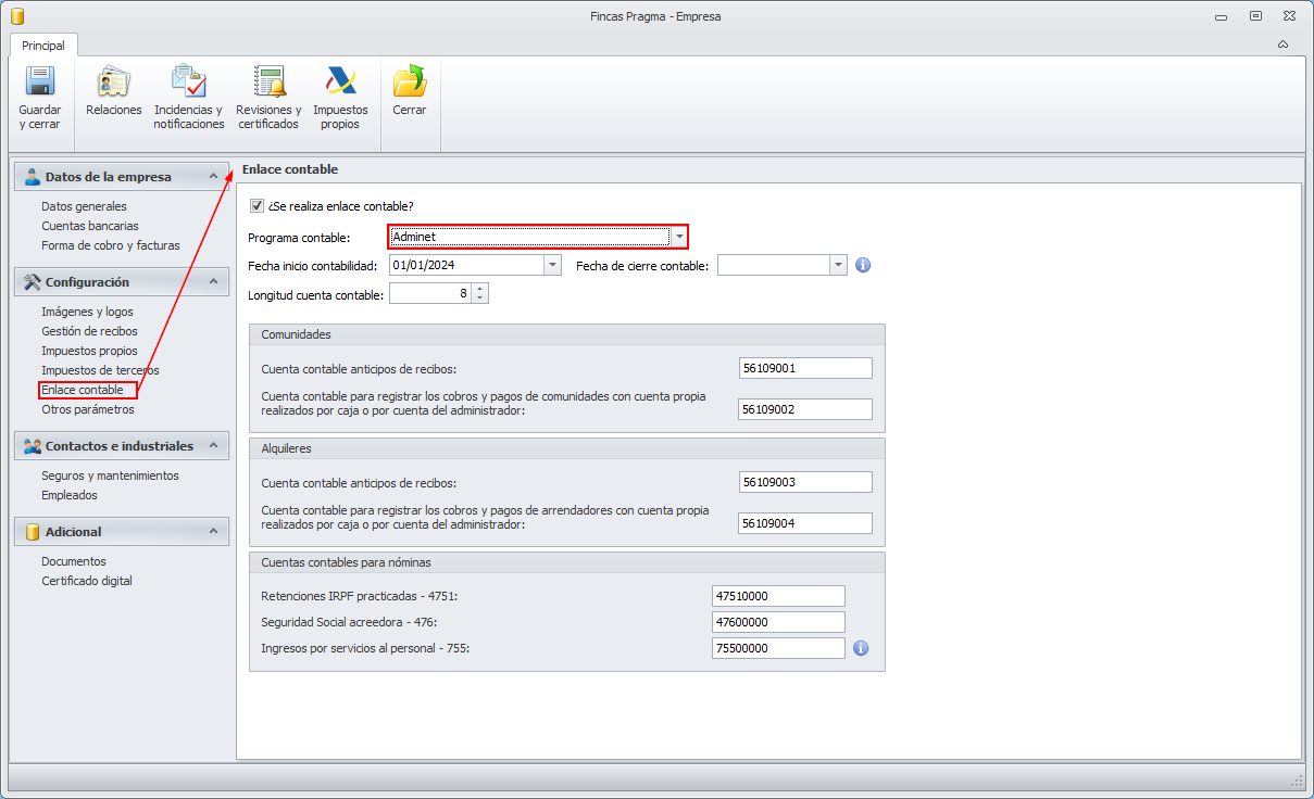 El enlace contable hacia el propio Adminet no precisa la generación de archivos de exportación-importación sino que genera automáticamente los asientos en la base de datos, dejándolos vinculados al propio enlace contable.