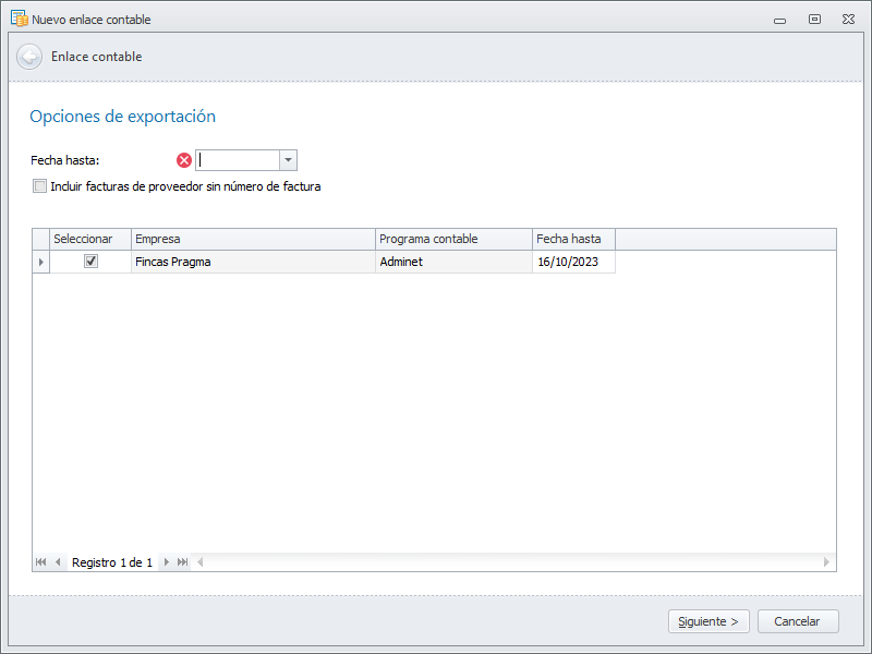 Fecha hasta: Es la fecha hasta la que desea exportar los datos a la contabilidad.