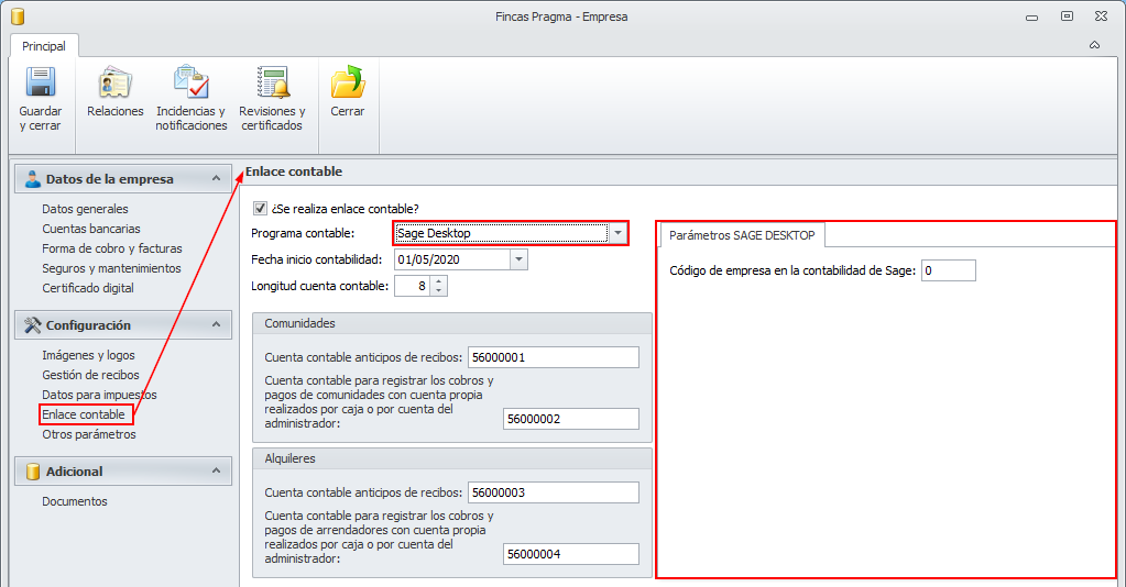 Código de empresa en la contabilidad de Sage: Debe indicar el código de empresa de la contabilidad de Sage en la que se deben enlazar los asientos de adminet.